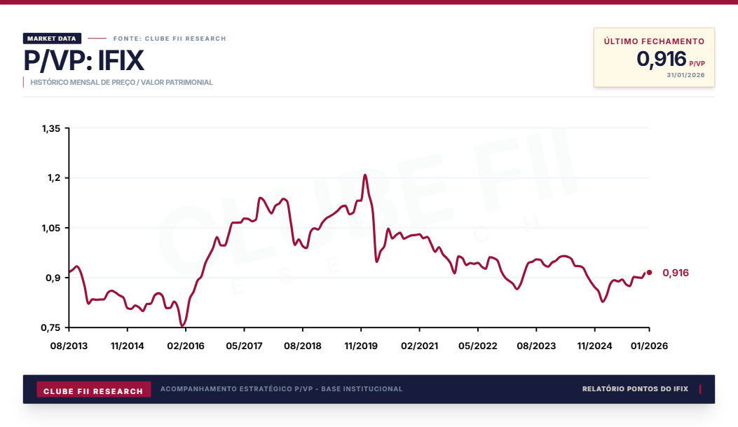 O IFIX iniciou o ano com um desconto médio próximo de 17% no P/VP, algo que não víamos havia cerca de dez anos. Nem mesmo durante a pandemia esse nível médio de desconto apareceu.