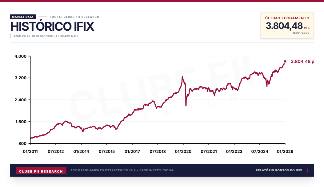 O IFIX encerrou 2025 renovando máxima histórica, próximo dos 3.775 pontos, e já iniciou 2026 avançando novamente, acima dos 3.800 pontos.
