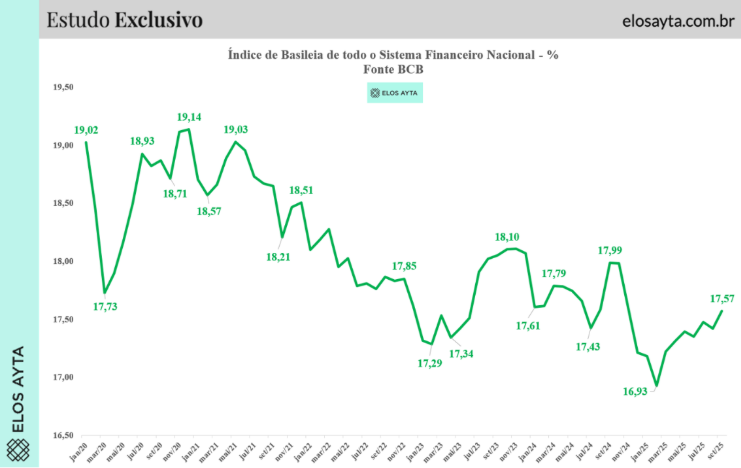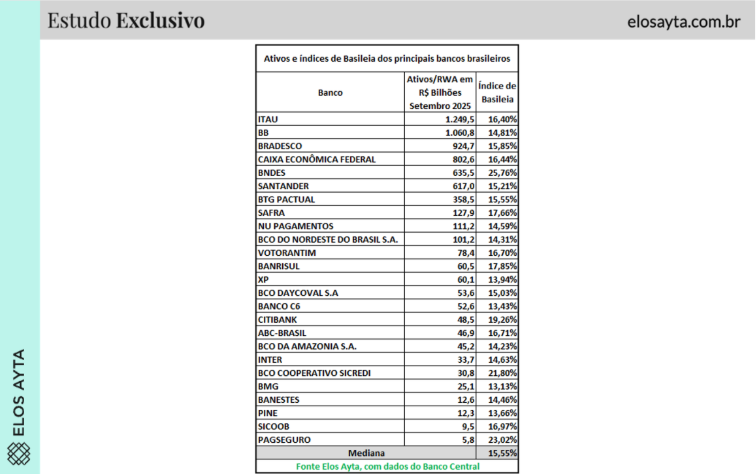 Dados agregados mostram que o índice médio do Sistema Financeiro Nacional tem se colocado consideravelmente acima do mínimo exigido. Segundo cálculos da Elos Ayta, com base em informações do Banco Central, a mediana do índice de Basileia dos 25 maiores bancos brasileiros era de 15,55% em setembro de 2025. Ou seja, para cada R$ 100 emprestados, os bancos tinham R$ 15,55 em capital dos sócios para cobrir eventuais problemas, além do total que já estava na PDD. Isso é quase o dobro da exigência internacional.