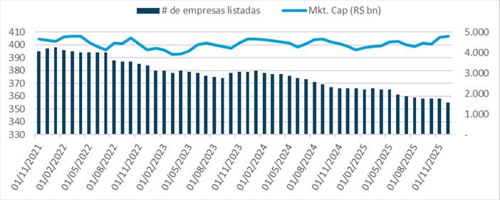 Dados da B3 mostram que, desde o final de 2021, o número de empresas listadas caiu 11%, passando de 398 para 355 ao final de 2025. No mesmo período, o valor de mercado agregado permaneceu praticamente estagnado, avançando de R$ 4,6 trilhões para R$ 4,8 trilhões. Em outras palavras, há cada vez menos empresas disponíveis para investimento, ao mesmo tempo em que o número de ETFs focados nesse mercado continua crescendo. Pelas nossas estimativas, existe atualmente quase um ETF de ações para cada seis empresas listadas na bolsa brasileira.