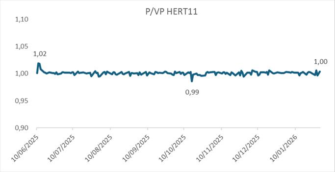 Além disso, os ETFs endereçam uma característica específica do mercado de FIIs: o frequente descasamento entre valor patrimonial e preço de mercado. Por contarem com formadores de mercado atuantes e com os mecanismos de criação e resgate de cotas, os ETFs tendem a negociar próximos ao seu valor patrimonial líquido. No caso do HERT11, por exemplo, a relação cota mercado/valor patrimonial era de 1,00 no fechamento de janeiro 2026.