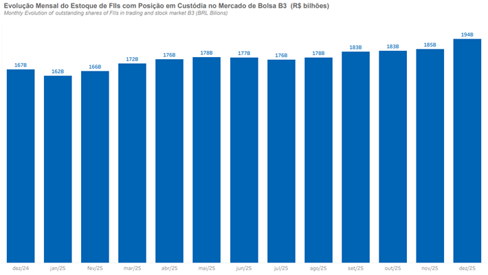 Enquanto o mercado acionário doméstico se reduzia, o mercado de fundos imobiliários (FIIs) apresentou crescimento relevante, mesmo diante de choques exógenos, como a pandemia da COVID-19, e de um ambiente macroeconômico desafiador, marcado por taxas de juros elevadas. Entre o final de 2021 e o final de 2025, o número de FIIs listados cresceu 6,7%, passando de 402 para 429 fundos, segundo dados históricos e boletins da B3. Em termos de valor de mercado, o crescimento foi ainda mais expressivo: alta de 41%, de R$ 158 bilhões para R$ 194 bilhões no período. Ainda assim, existem apenas dois ETFs listados no Brasil com foco em FIIs.
