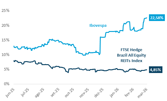 Sob essa perspectiva, os FIIs de tijolo têm apresentado sinais construtivos. Desde o lançamento do HERT11, em junho de 2025, a volatilidade anualizada dos ativos representados pelo FTSE Hedge Brazil All Equity REITs recuou de aproximadamente 8,0% para 4,8% em março de 2026. No mesmo período, o índice acumulou retorno de 14,38%, o que corresponde a uma taxa anualizada próxima de 19,68%. Em outras palavras, a classe apresentou simultaneamente compressão de volatilidade e valorização de preços, combinação que melhora sua atratividade sob a ótica de retorno ajustado ao risco.