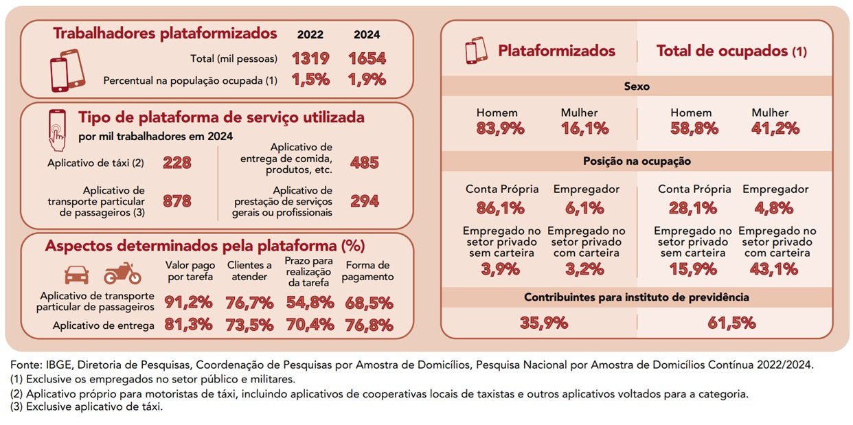 A pesquisa do IBGE lembra que a se, de um lado, as plataformas digitais de trabalho têm oferecido oportunidades de geração de renda para muitos trabalhadores e permitido que empresas alcancem novos mercados e reduzam custos, por outro, elas também representam um importante desafio, especialmente no que se refere às condições de trabalho.
