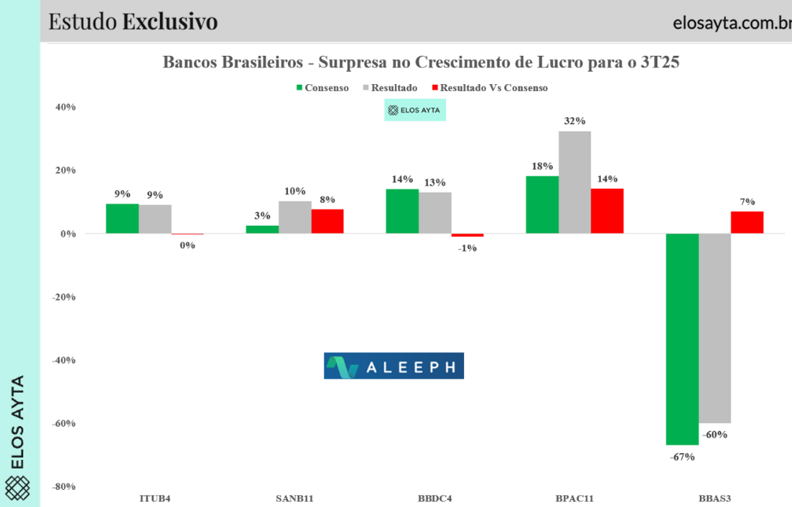 Com apoio da plataforma de consensus de mercado Aleeph, os dados da consultoria mostram que lucro agregado das cinco maiores instituições financeiras superou as expectativas para a maioria dos bancos, com destaque para o BTG Pactual, que apresentou resultado até 14% acima das projeções dos analistas.