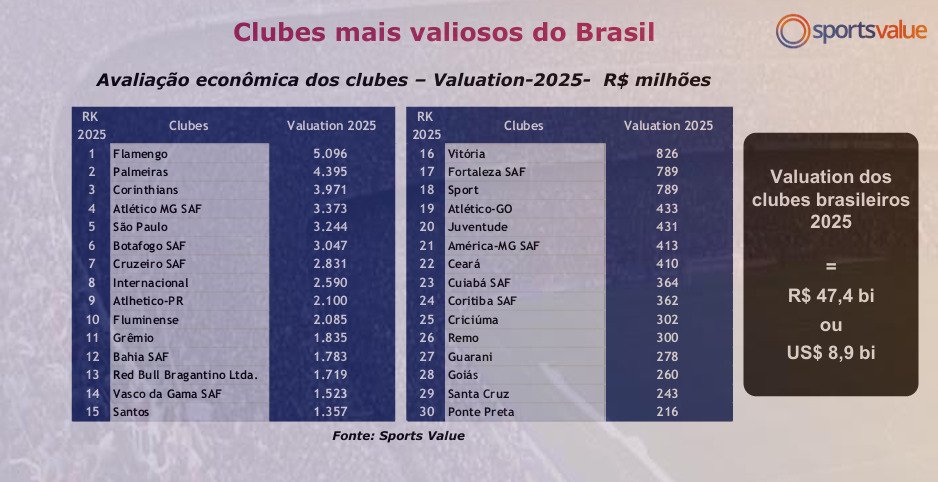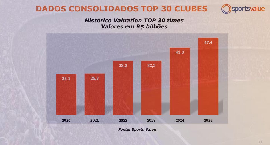 Estudo da Sports Value mostra salto de 15% no valor de mercado dos 30 maiores clubes do País em 2025