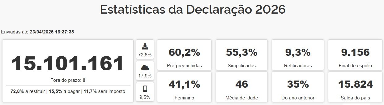 A Receita Federal já recebeu mais de 15 milhões de declarações do Imposto de Renda 2026. Até as 16h45 desta quinta-feira, 23, 15.101.161 declarações tinham sido enviadas. Do total de declarações enviadas, 60,2% utilizaram a opção pré-preenchida.