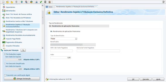 Este rendimento final deve ser informado no campo 06 – Rendimentos de aplicações financeiras da ficha Rendimentos Sujeitos à Tributação Exclusiva/Definitiva