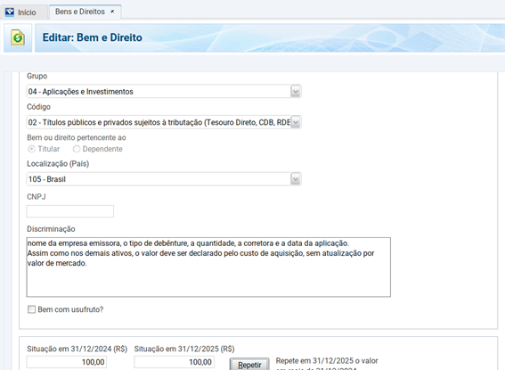Além disso, caso a debênture tenha sido adquirida em 2025, o campo Situação em 31.12.2024 (R$) deve permanecer em branco. Enquanto o campo Situação em 31.12.2025 (R$) deve ser preenchido com o valor pago na aquisição, acrescido de eventuais taxas. Contudo, não haverá atualização pelo valor de mercado.