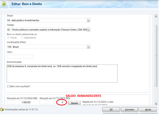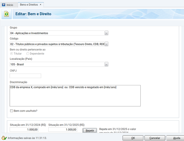 Para cada título, deve ser informado o CNPJ da instituição financeira, a descrição da aplicação e os valores existentes em 31 de dezembro do ano anterior e do ano-base (2025), conforme o informe de rendimentos.