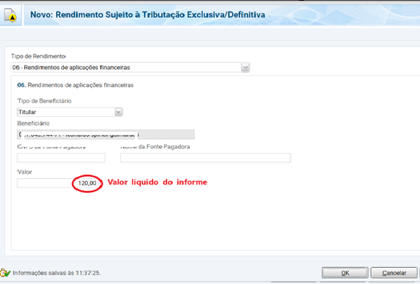 Já os rendimentos auferidos devem ser declarados na ficha “Rendimentos Sujeitos à Tributação Exclusiva/Definitiva”, o campo de aplicações financeiras, utilizando-se o valor líquido registrado no informe.