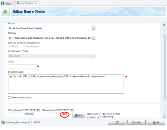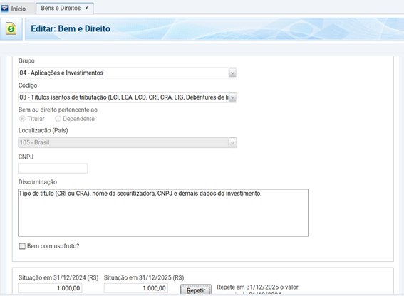 Já em 31/12/2025 deve ser colocado o saldo dos títulos. O lançamento para o CRI e CRA deve ser para cada título possuído que o contribuinte tiver.