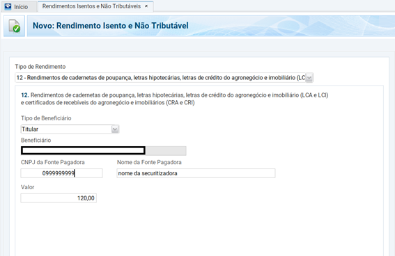 Além da ficha de Bens e Direitos, o investidor precisa declarar os rendimentos recebidos no ano, mesmo sendo isentos. Para isso, ele deve informar estes na ficha Rendimentos Isentos e Não Tributáveis, escolhendo na aba Tipo de Rendimento o código 12 – Rendimentos de cadernetas de poupança, letras hipotecárias, letras de crédito do agronegócio e imobiliário (LCA e LCI) e certificados de recebíveis do agronegócio e imobiliários (CRA e CRI).