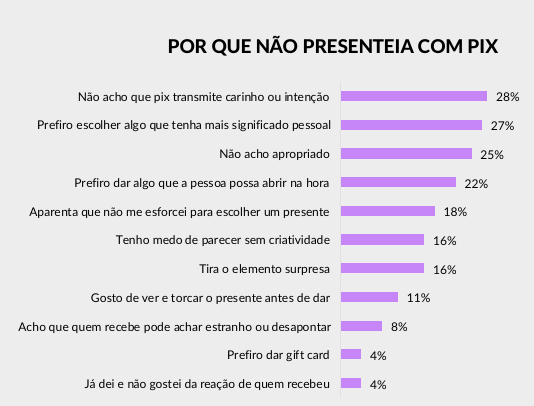 Mas, segundo o antropólogo, mesmo nas relações mais íntimas, o uso do Pix não deve ultrapassar esse um terço das ocasiões de presentear. Isso por que, conforme identificado pela pesquisa, o Pix comunica praticidade, mas não dedicação.