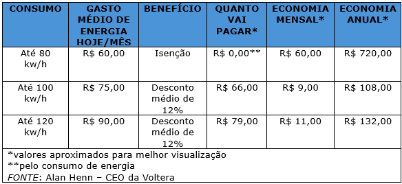 A pedido de IstoÉ Dinheiro, Alan Henn, CEO da Voltera, calculou quanto será a economia para consumidores de até 80 kW/h, 100 kW/h e 120 kW/h com o novo programa, baseado no gasto médio mensal de energia hoje, considerando o custo do kW/h entre R$ 0,736 e R$ 0,772.