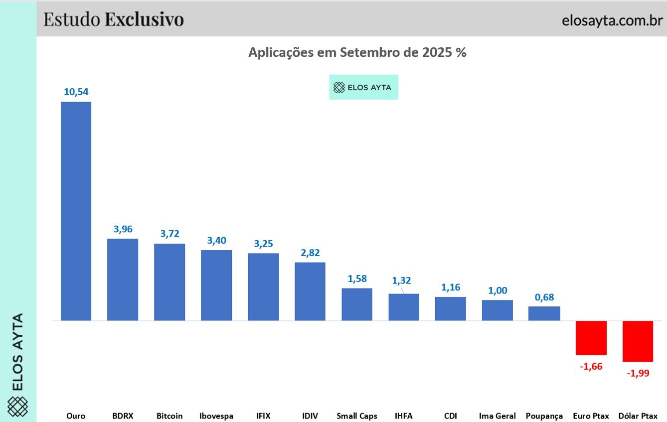 O mês de setembro foi generoso com a maior parte das aplicações. Entre as 13 ativos do mercado analisados pela consultoria Elos Ayta, 11 fecharam no azul. Quem brilhou no mês passado foi o ouro, com uma valorização de 10,54%, mais que o dobro do segundo colocado. Atrás do metal precioso ficou o índice de BDRs (que reúne recibos de ações estrangeiras negociados na B3), com alta de 3,96%.