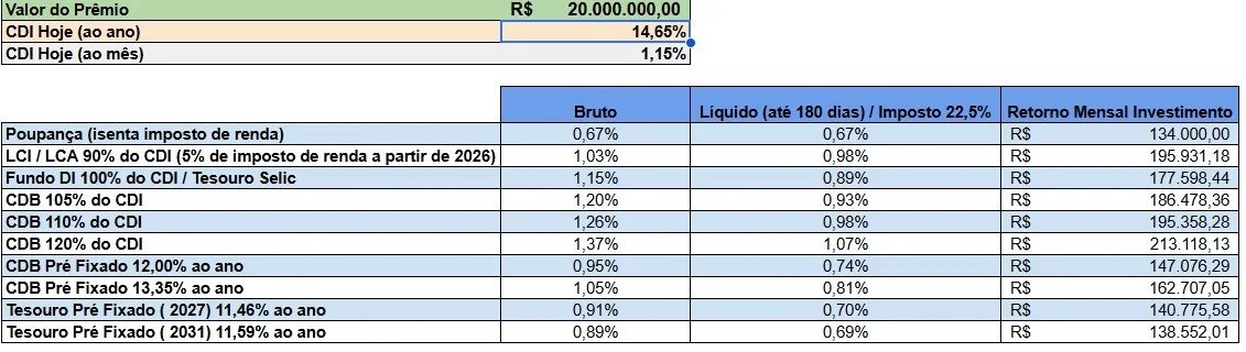Como é possível avaliar na simulação, os R$ 20 milhões do prêmio, se investidos em LCI/LCA com 90% do CDI, renderiam ao investidor mais de R$ 195,9 mil por mês. Se aportados no Fundo DI 100% do CDI, o prêmio geraria um rendimento mensal de R$ 177,5 mil por mês.