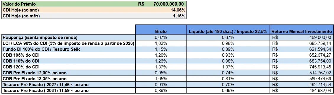 Como é possível avaliar na simulação, os R$ 70 milhões do prêmio, se investidos em LCI/LCA com 90% do CDI, renderiam ao investidor mais de R$ 685,7 mil por mês. Se aportados no Tesouro Selic, o prêmio geraria um rendimento mensal de R$ 621,5 mil por mês.